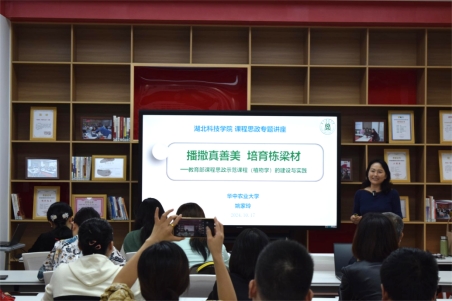 2024年10月17日,第四期教师教育教学能力提升工作坊暨课程思政示范课程培育与课程思政资源库平台使用培训在学校课程思政教学研究示范中心成功举行。湖北名师、湖北省“楚天园丁奖”获得者、华中农业大学博士生导师姚家玲教授,新华思政运营部主管宋一冉老师以及我校音乐学院唐珊珊副教授应邀作课程思政建设专题讲座。来自全校各学科性学院的40余名教师代表参加了此次培训。培训活动由教务处处长鲍翠玉教授主持。